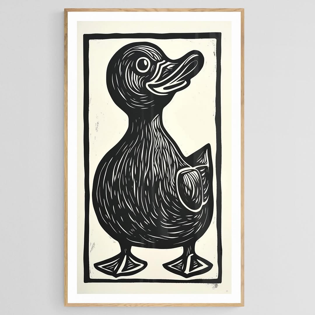 Linoleum engraving art of a duck in black and white.