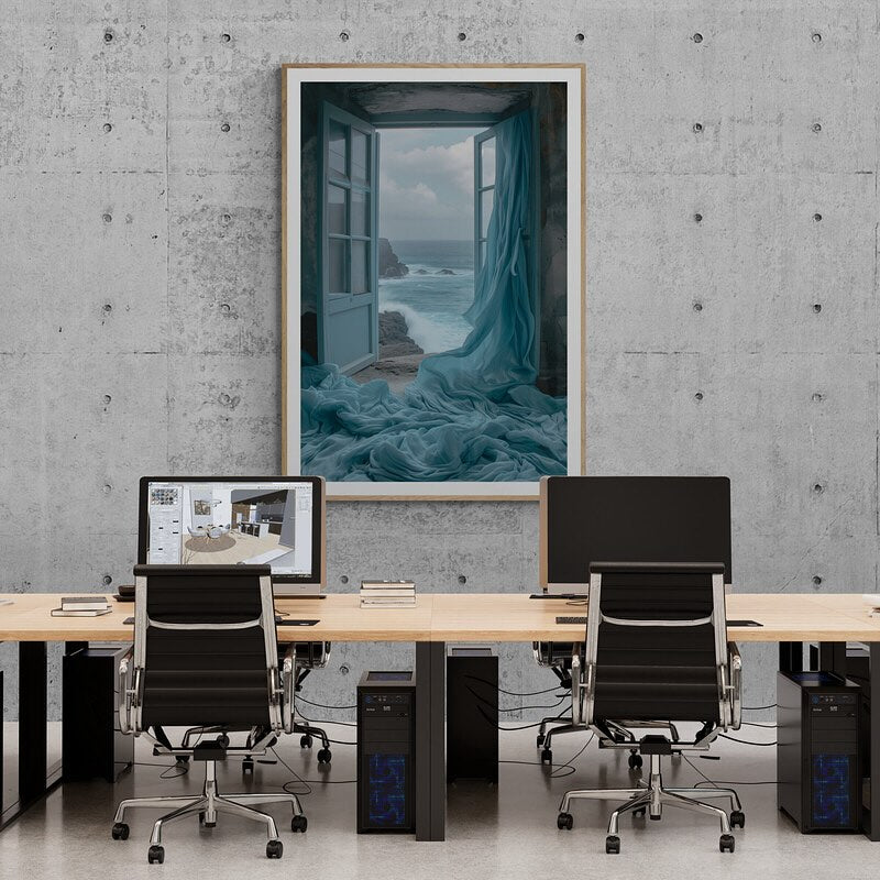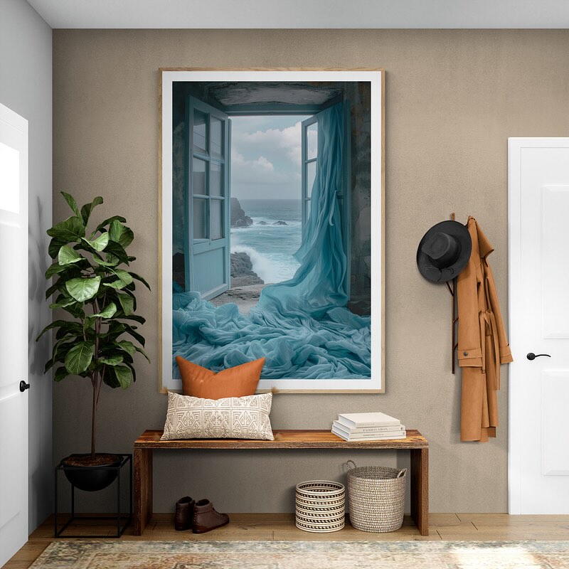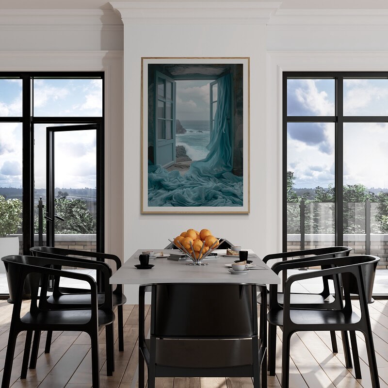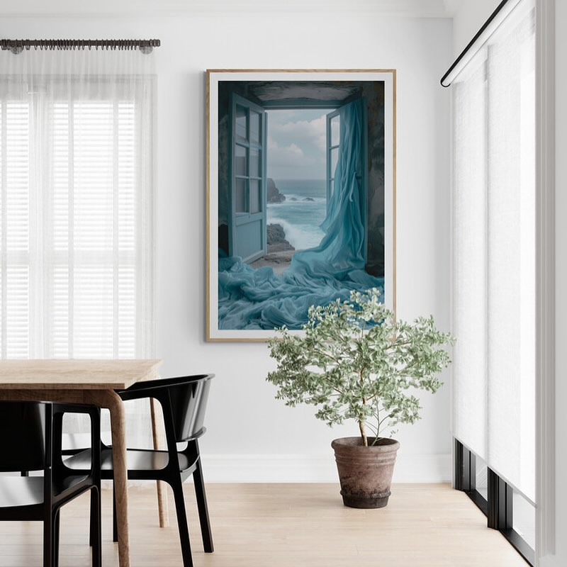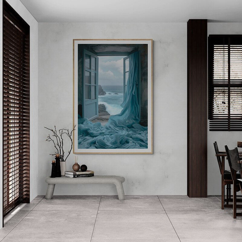 Photograph of surreal dream of room overlooking a beach with a large blue fabric.