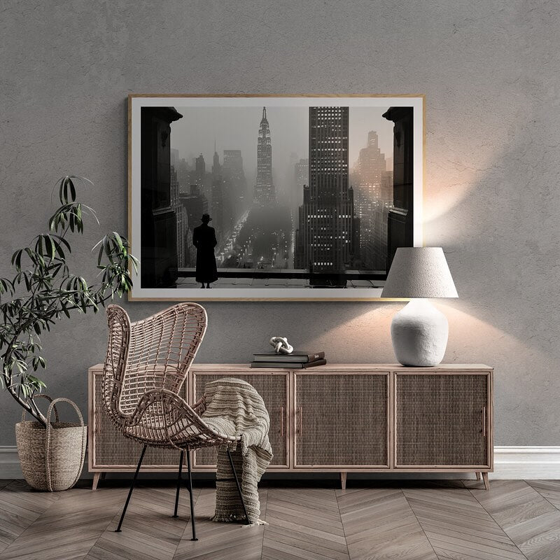 Para obras enmarcadas, sugerimos quitar con cuidado el embalaje protector y colgarla con la ayuda de dos personas, usando clavos resistentes. En el caso de obras de gran tamaño, si es posible, utiliza tornillos y tacos de pared.
