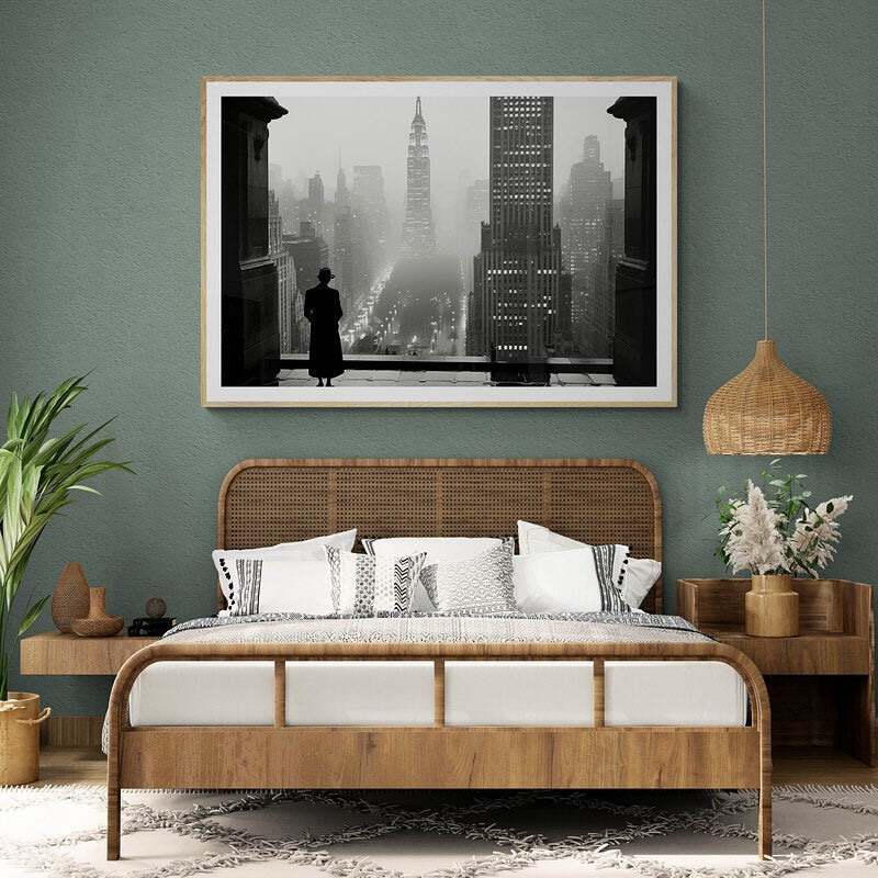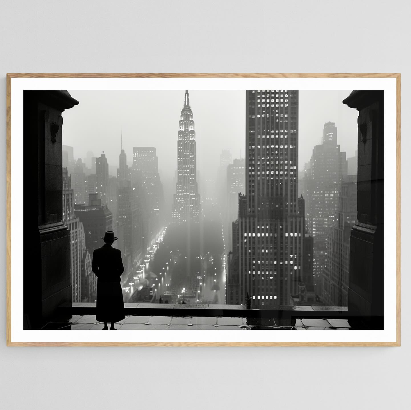 Photograph of a man standing watching the skyline during the 1930s in New York City.