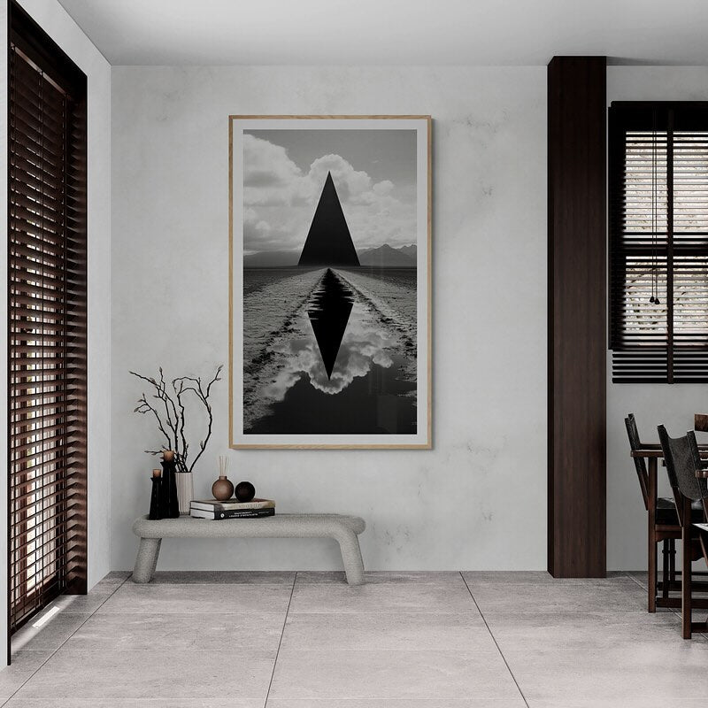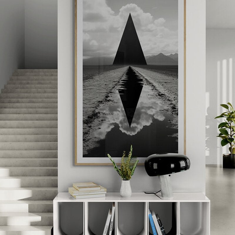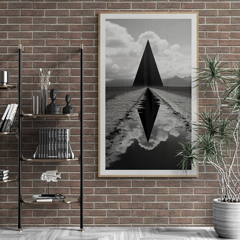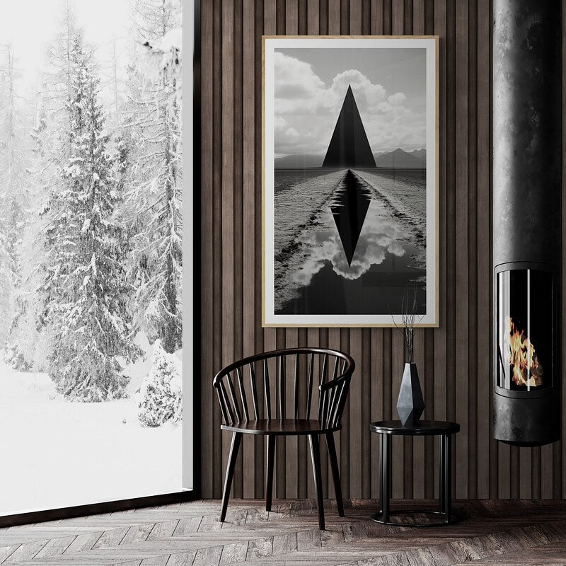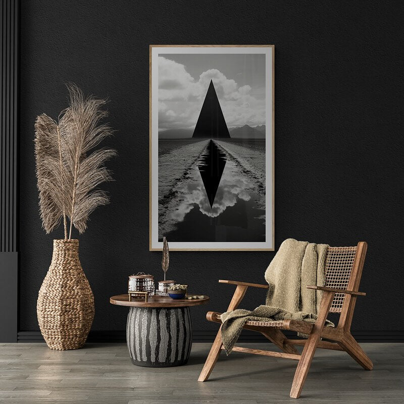 Black and white sci-fi photograph of a black triangle in a field in foundation style.