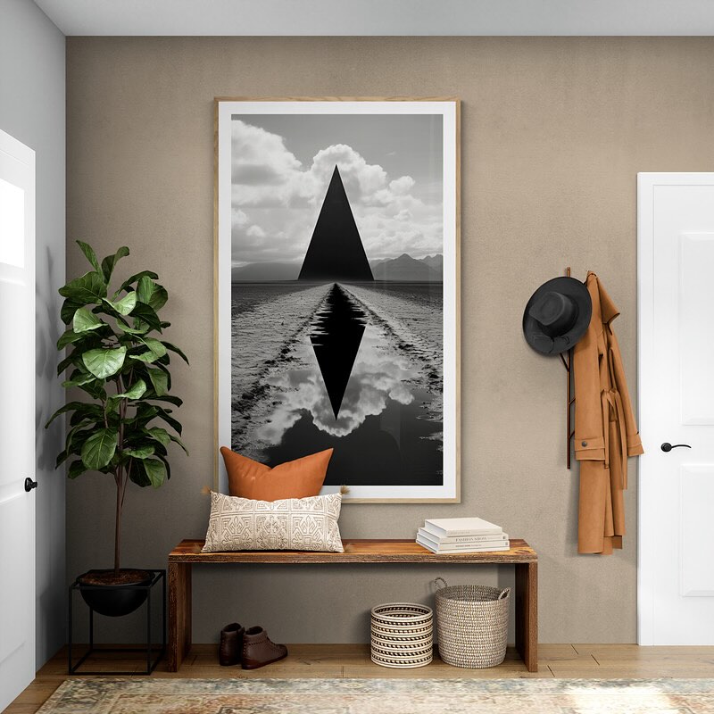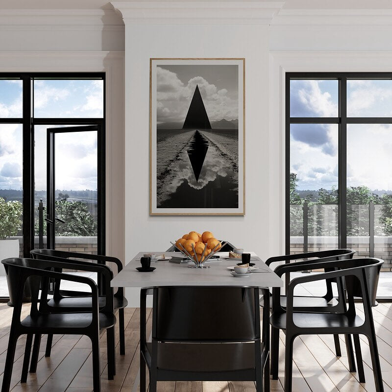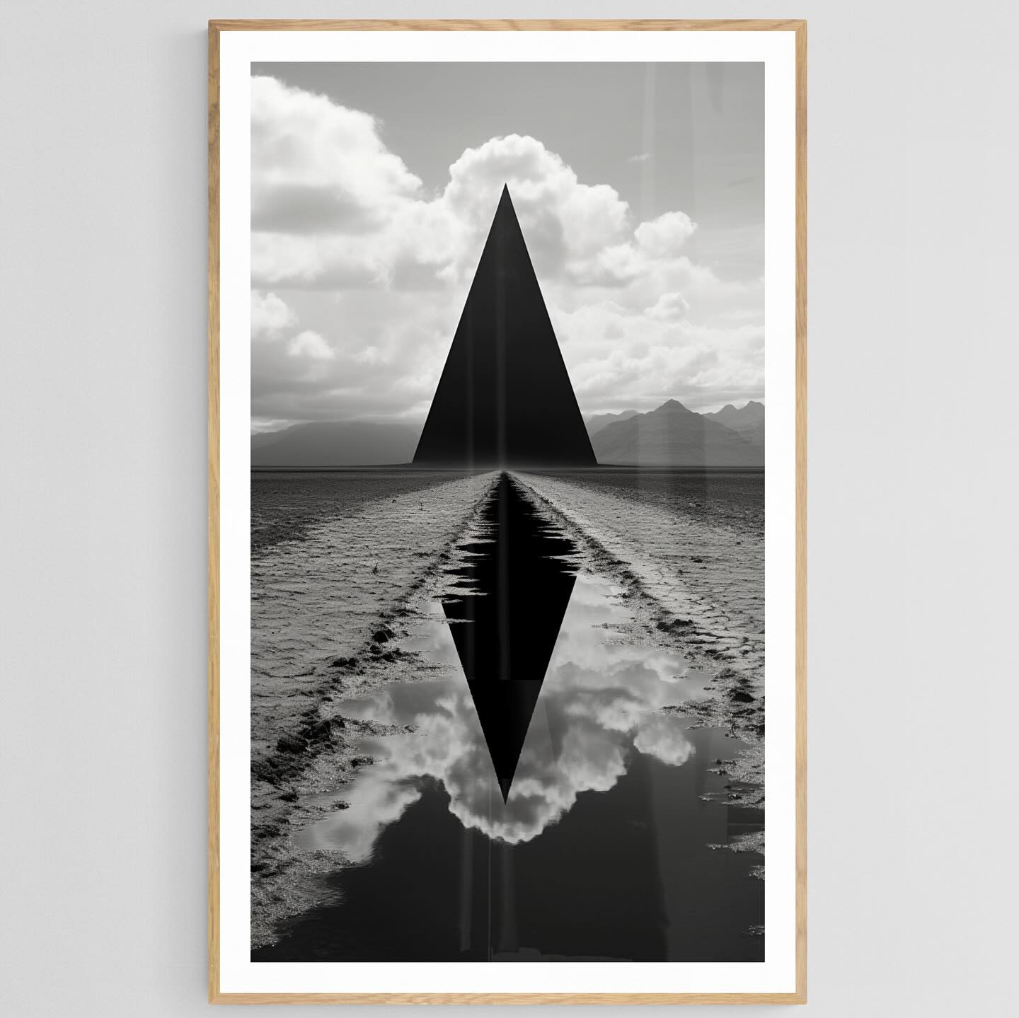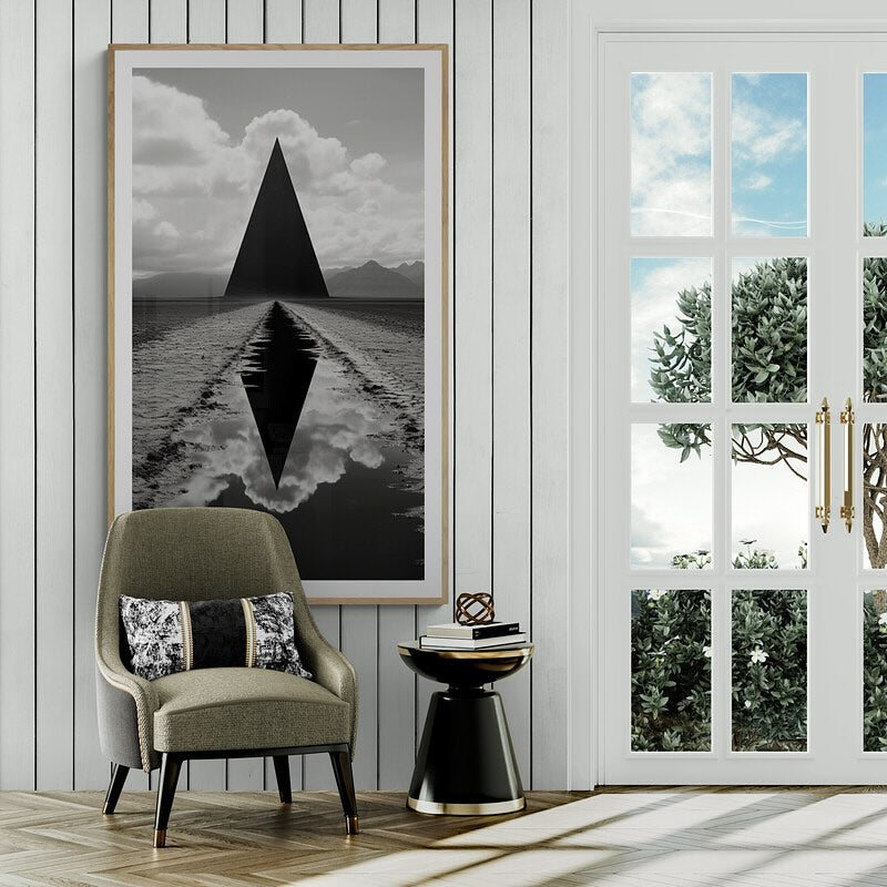 Black and white sci-fi photograph of a black triangle in a field in foundation style.