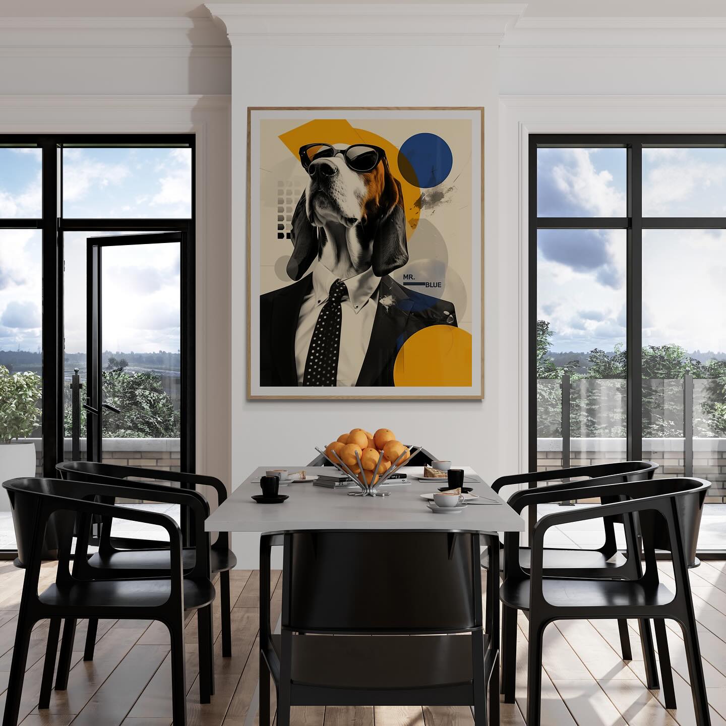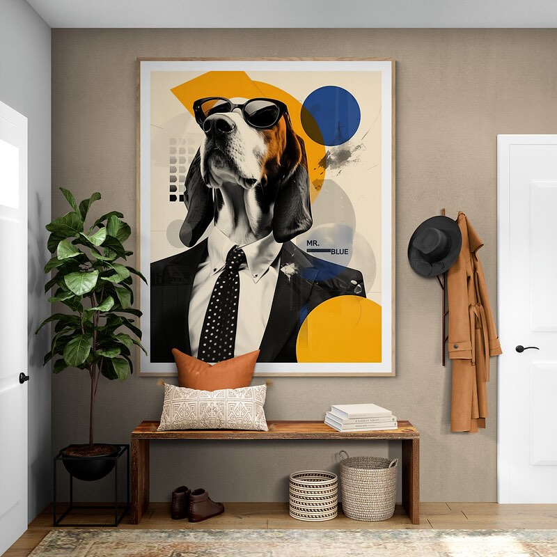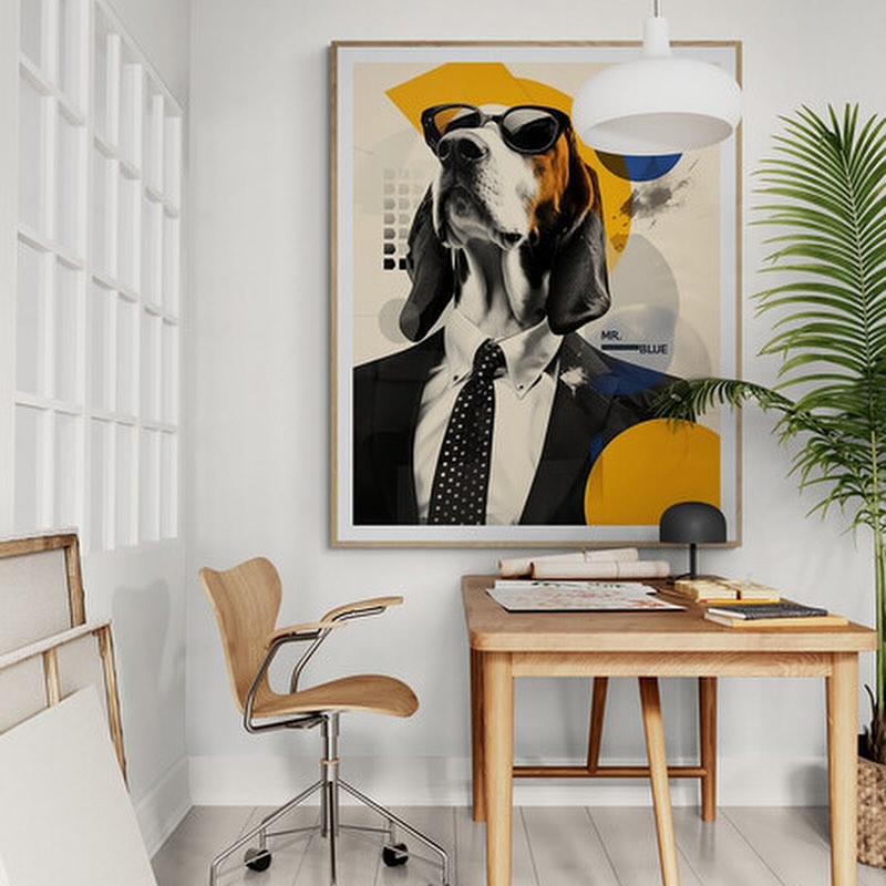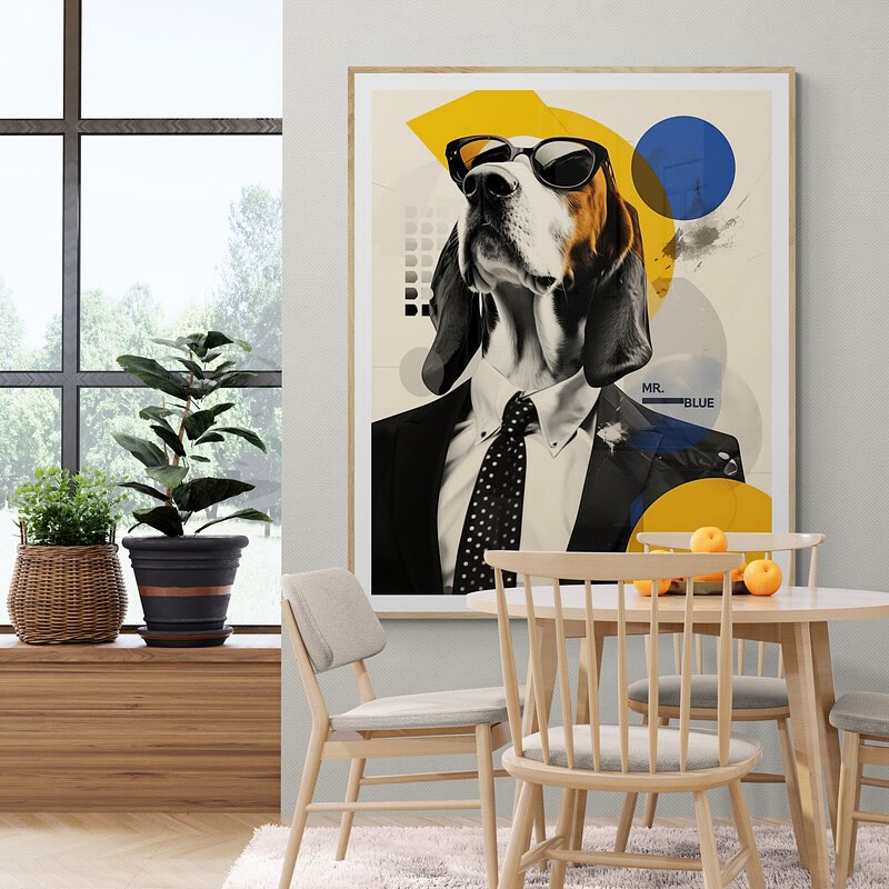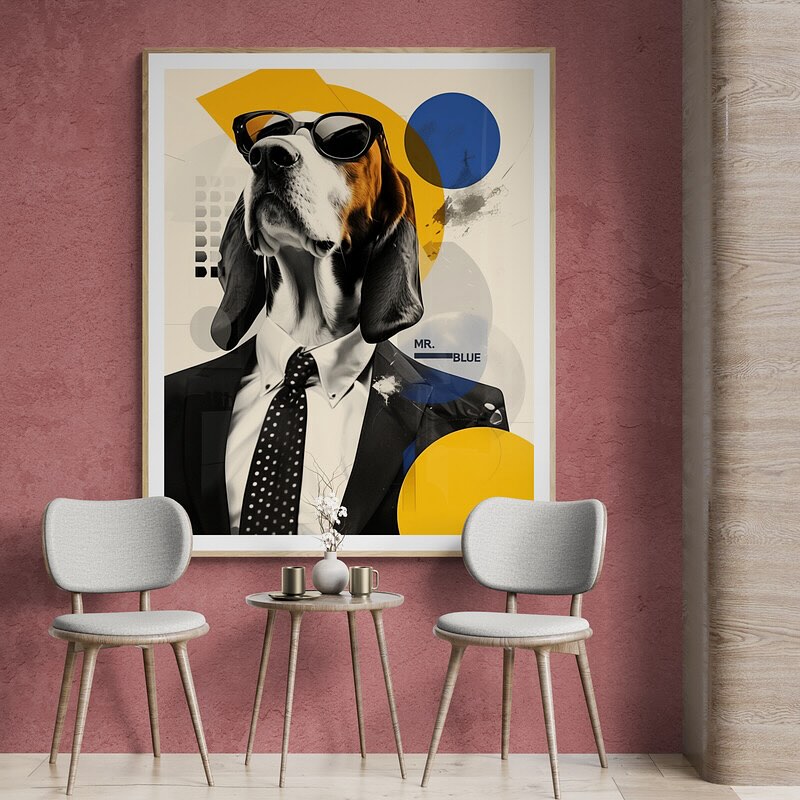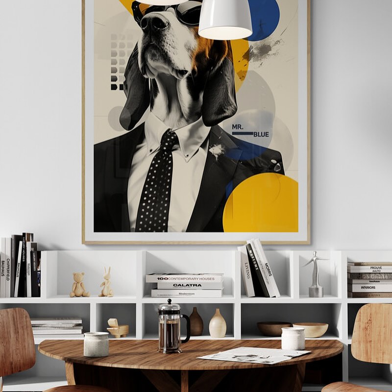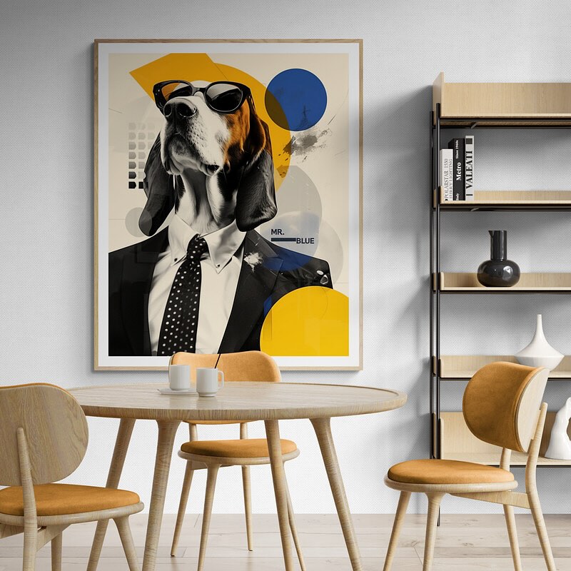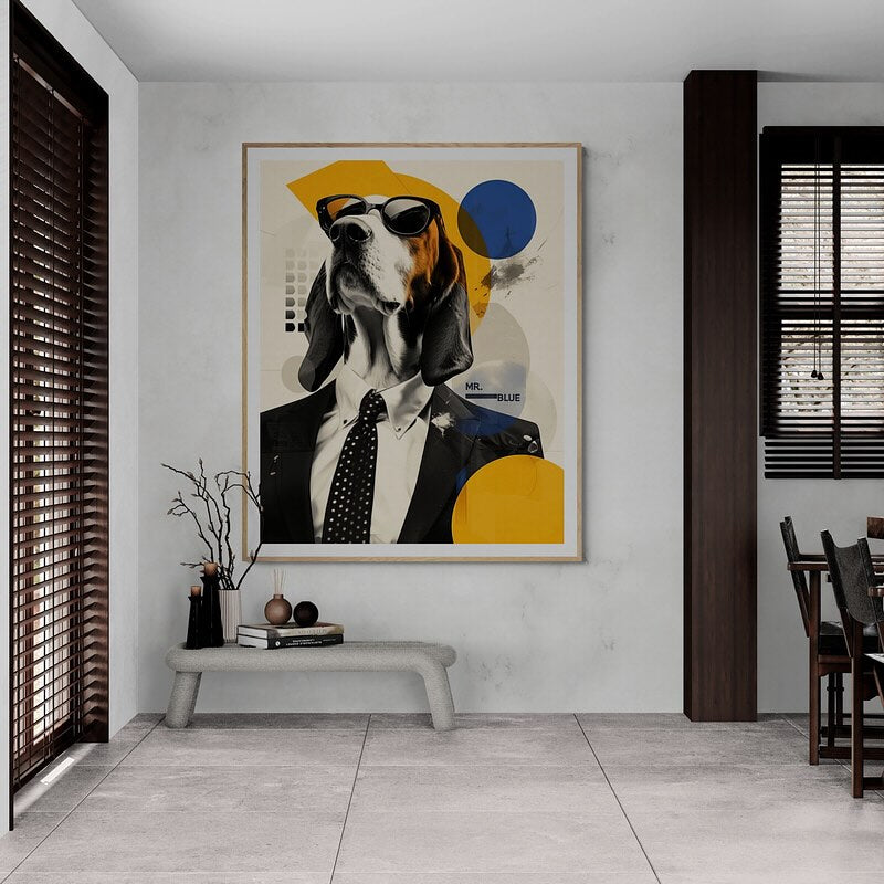 Mr Blue dog with glasses in a suit.