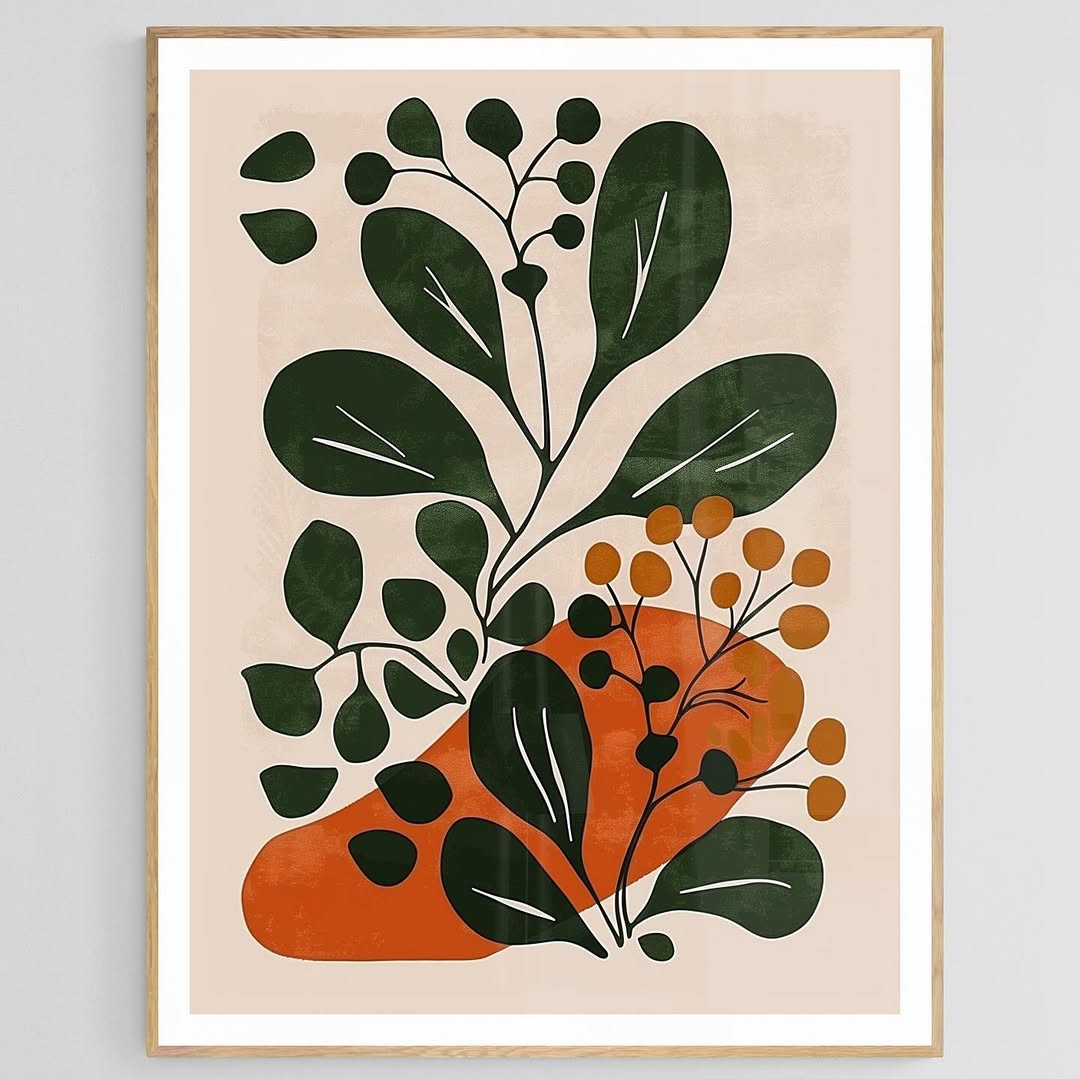 Matisse style abstract botanical, old green and old orange colors, minimalist.