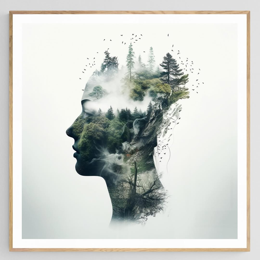 Pareidolia of a face and a forest with birds in white background.