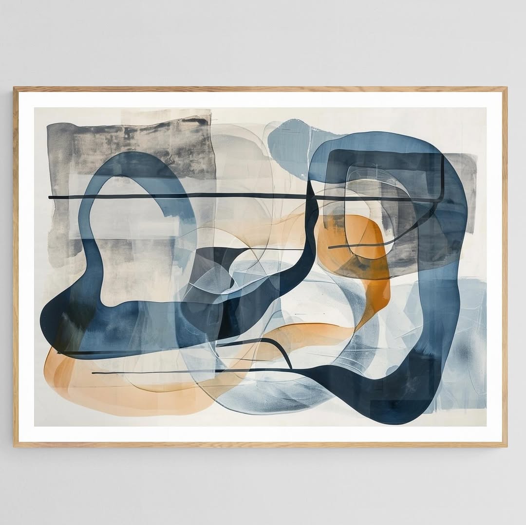 Blues and grey art print, in the style of curves, letras y figuras, expressive use of line, beige, figura serpentinata, suspended/hanging, soft lines and shapes