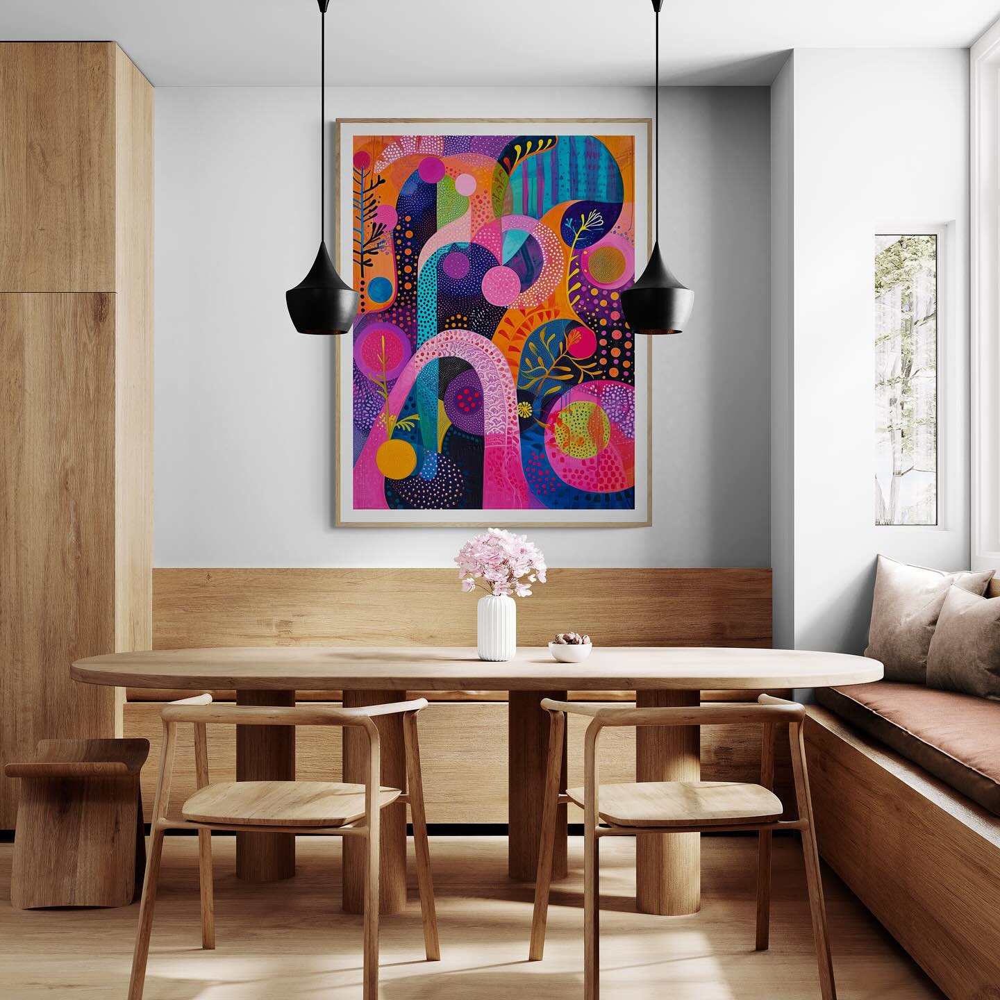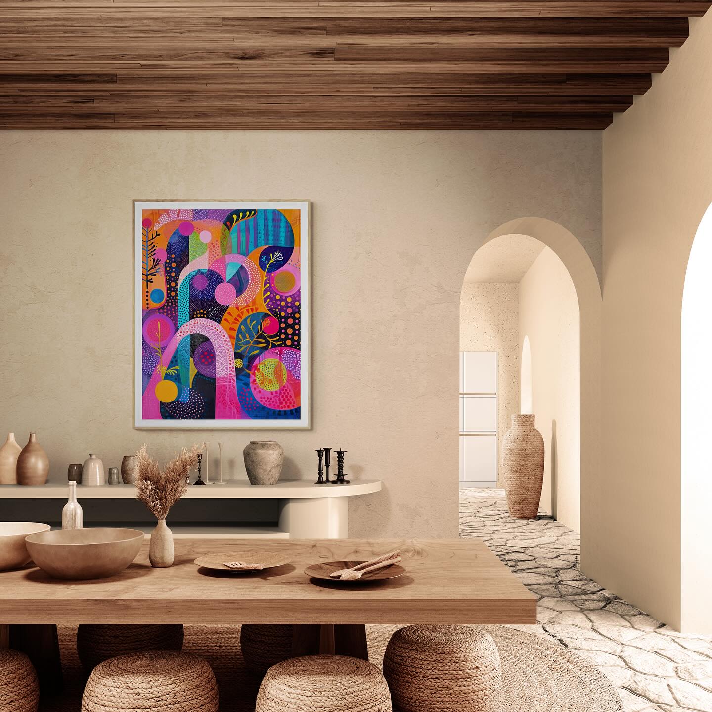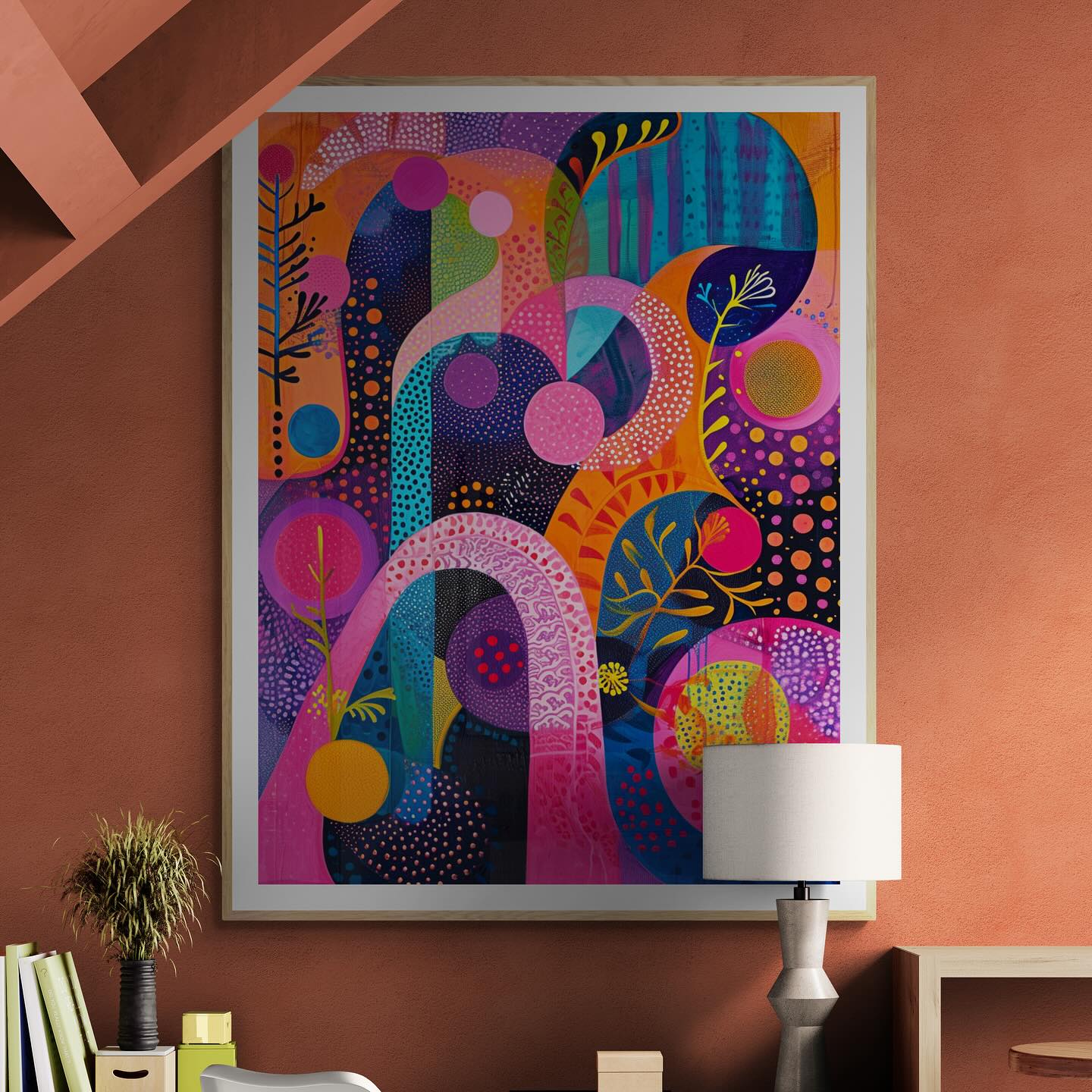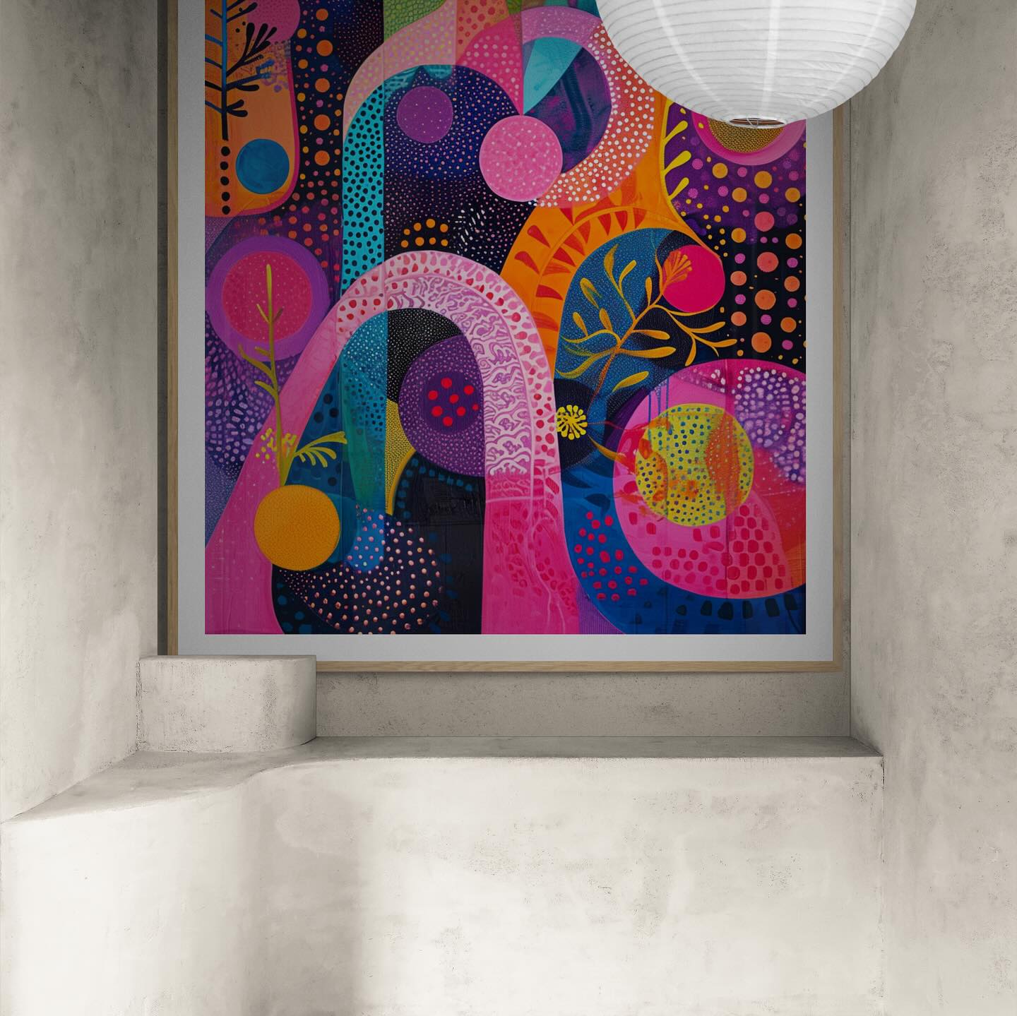 Abstract, vibrant painting that reflects a fusion of organic and geometric shapes, with a color scheme dominated pastel colours mainly earthy accentuating neon highlights.