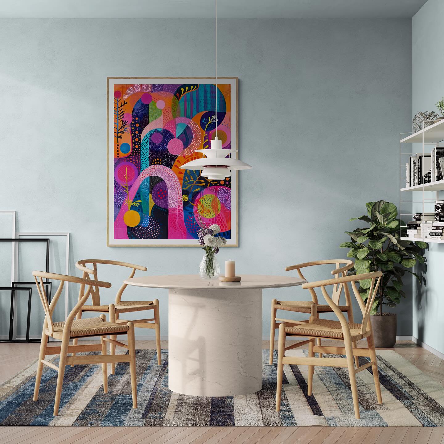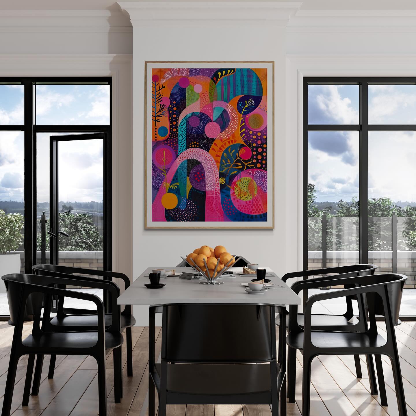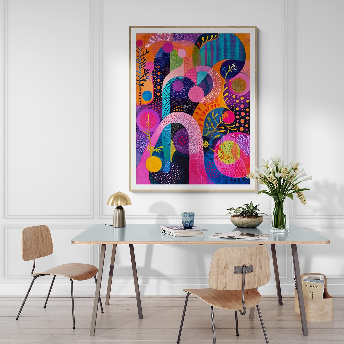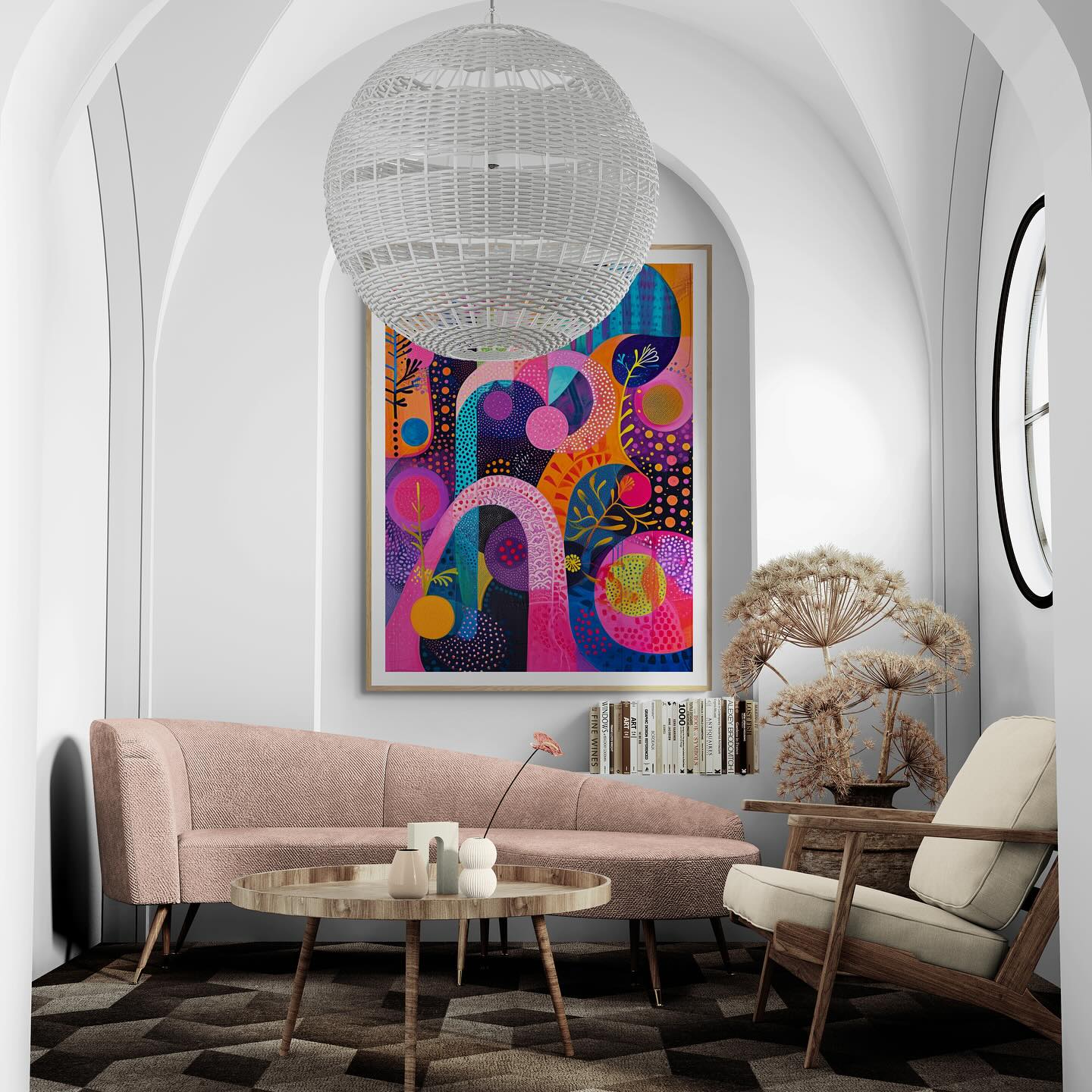 Abstract, vibrant painting that reflects a fusion of organic and geometric shapes, with a color scheme dominated pastel colours mainly earthy accentuating neon highlights.