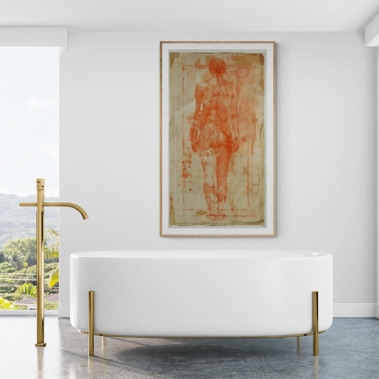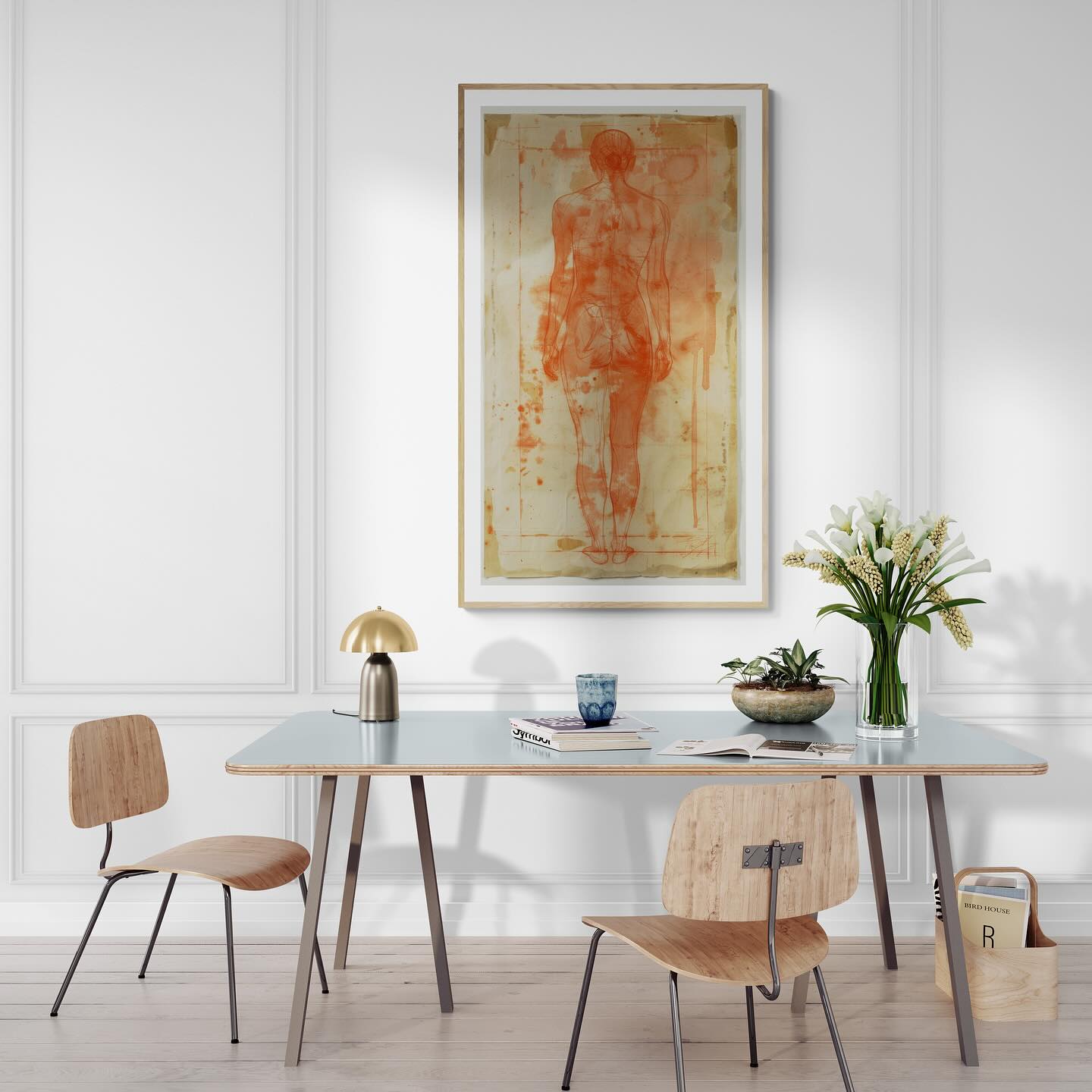 Leonardo Davinci style vintage sketch of a person from the back in orange ink.