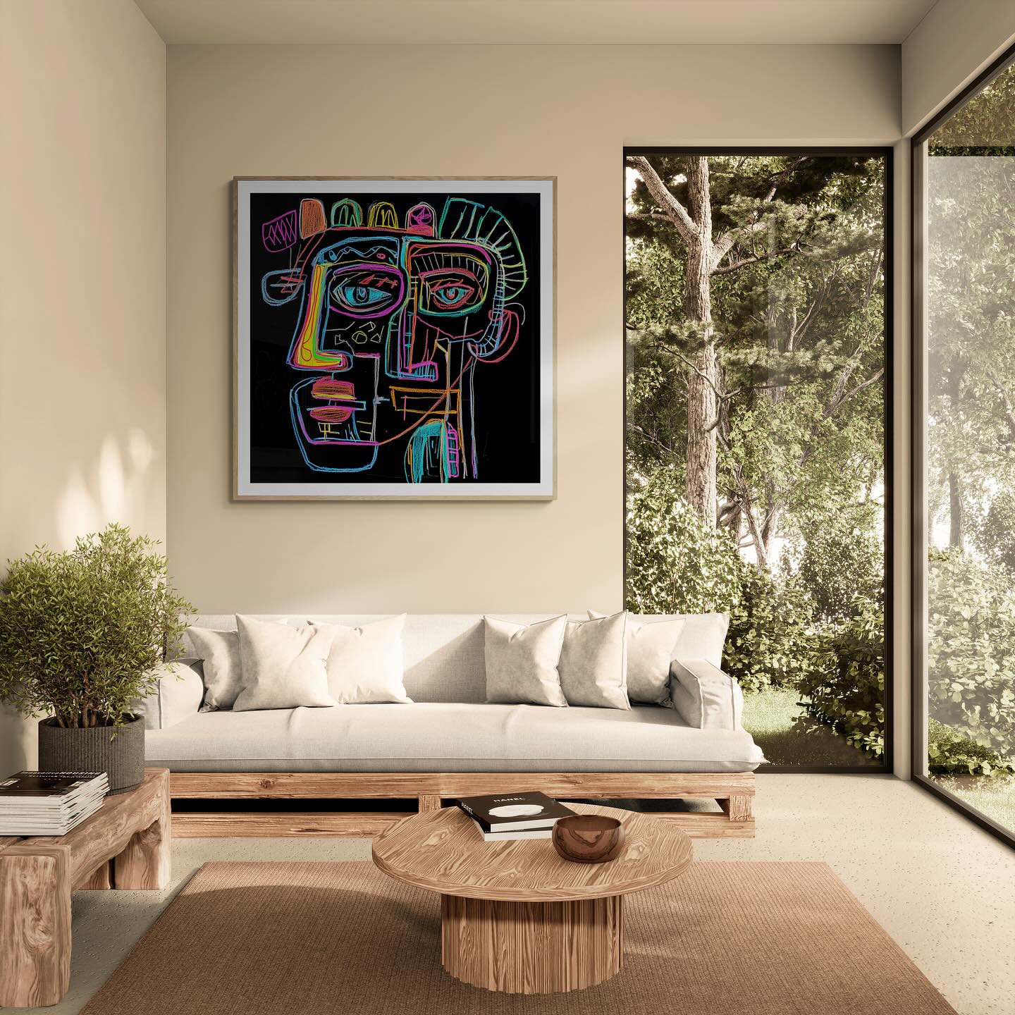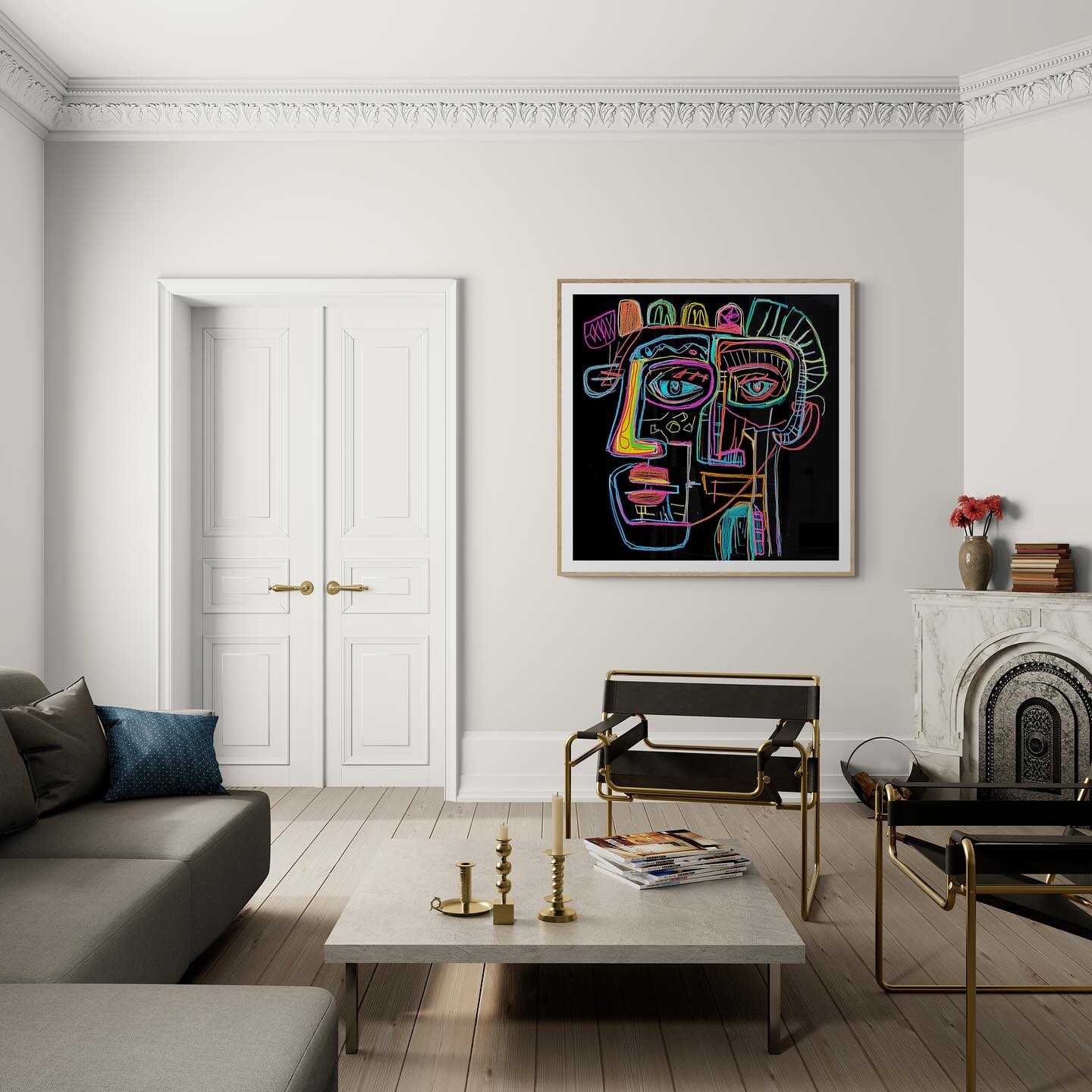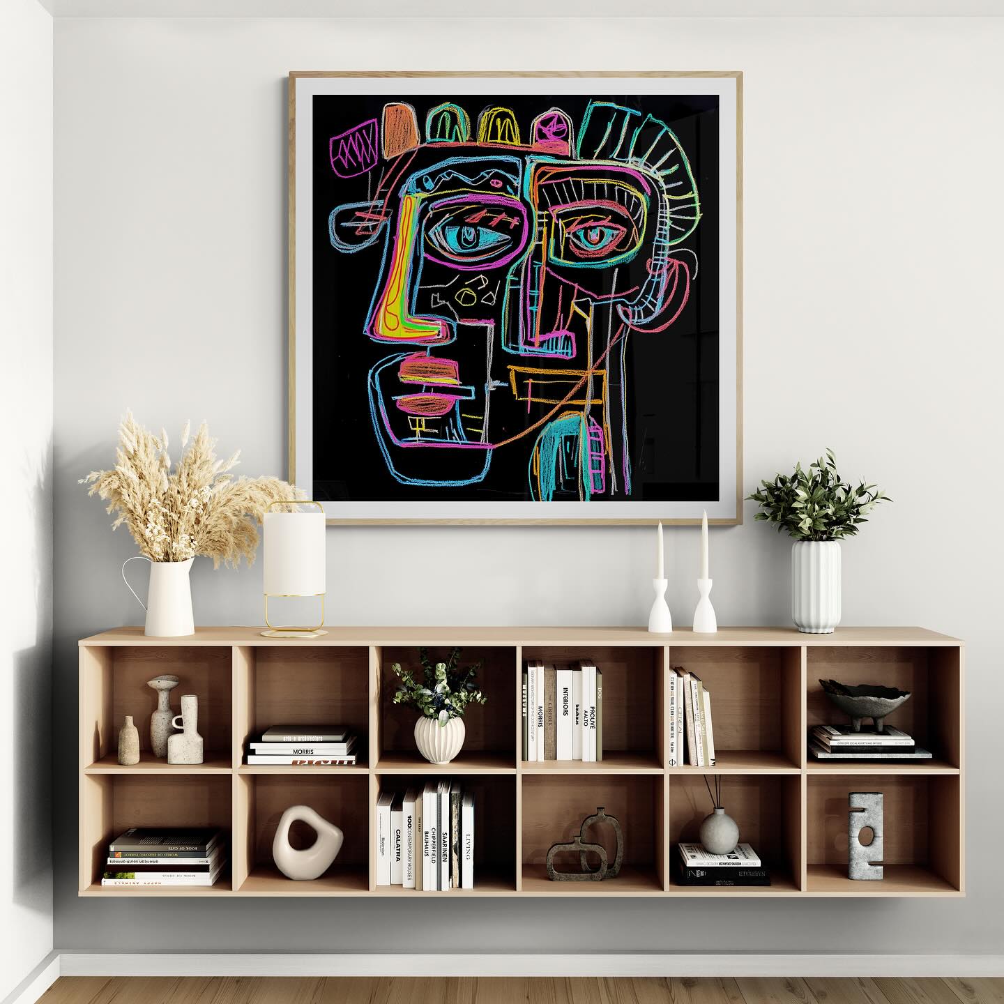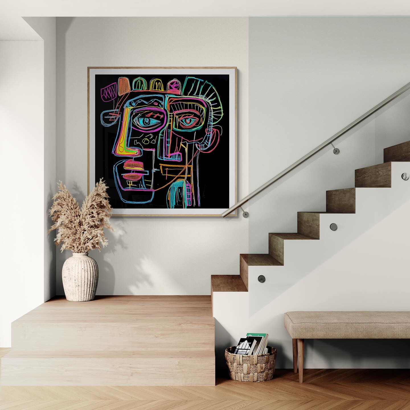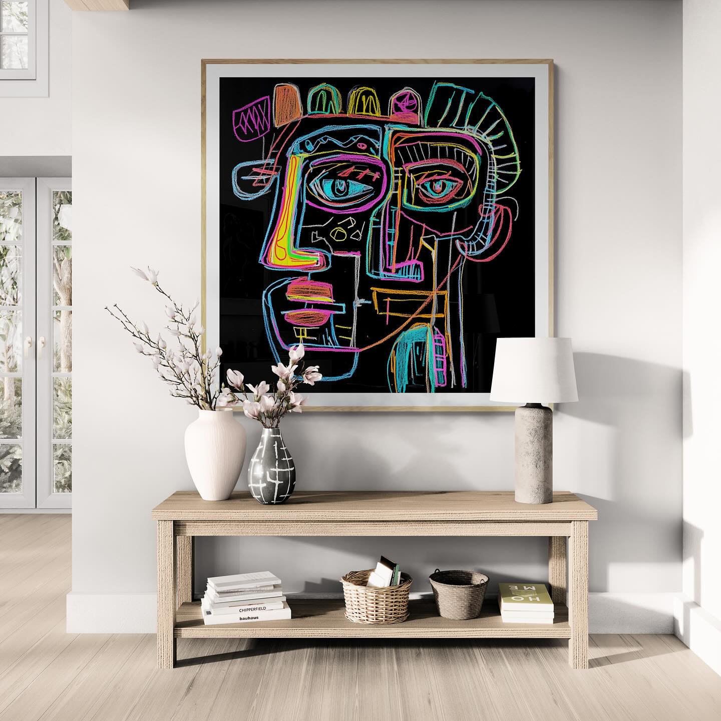 Two faces expressionist abstraction, marker pen hand drawing, in neon colors with black background, in style of Basquiat.