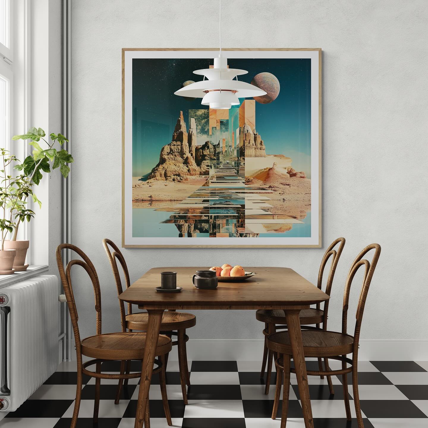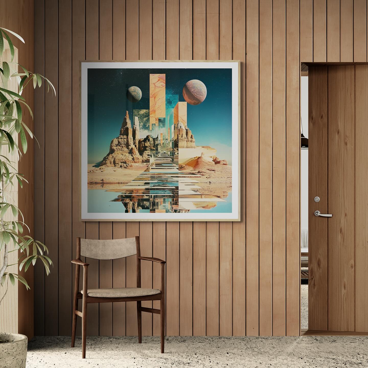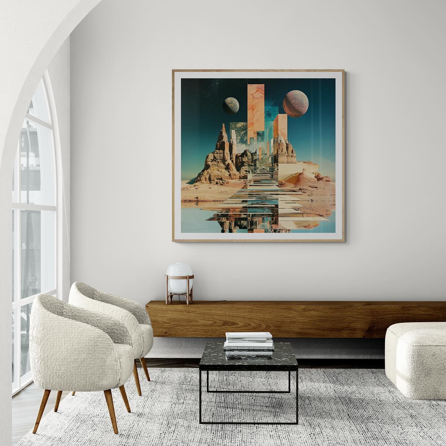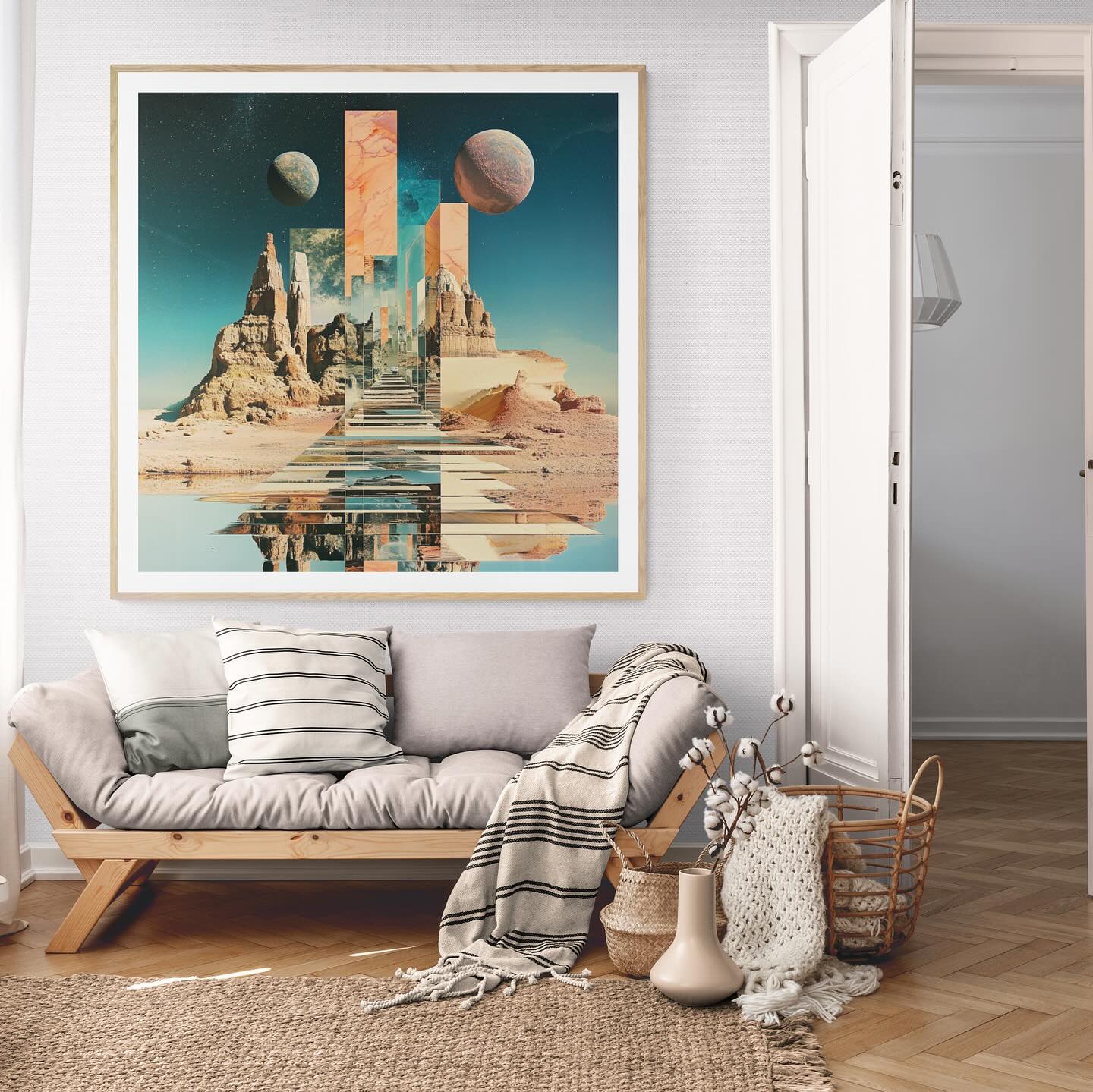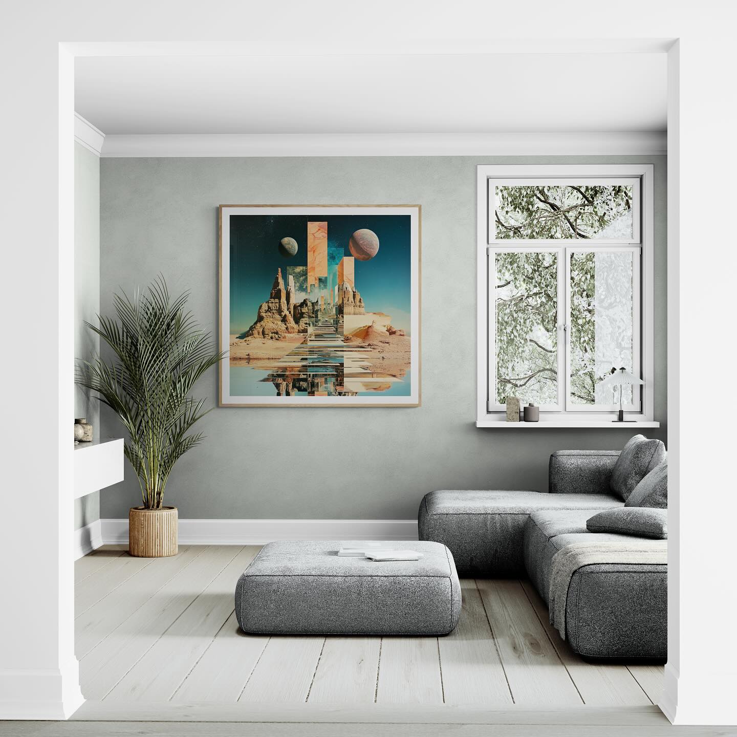 Para obras enmarcadas, sugerimos quitar con cuidado el embalaje protector y colgarla con la ayuda de dos personas, usando clavos resistentes. En el caso de obras de gran tamaño, si es posible, utiliza tornillos y tacos de pared.