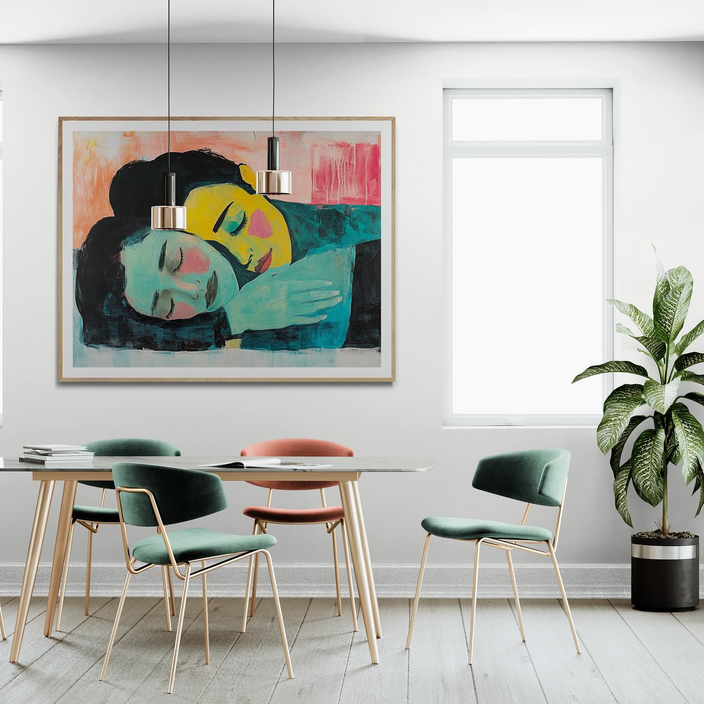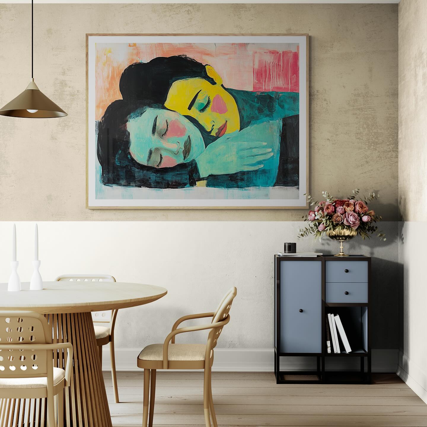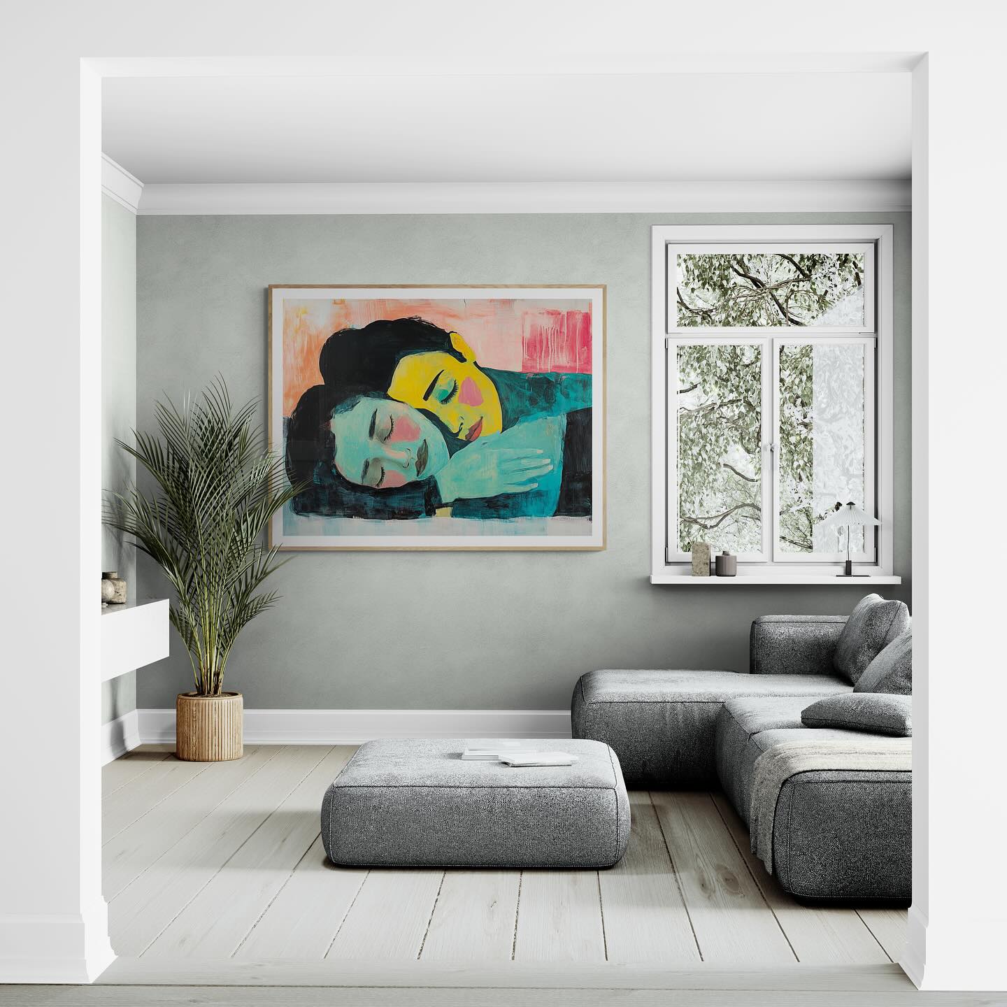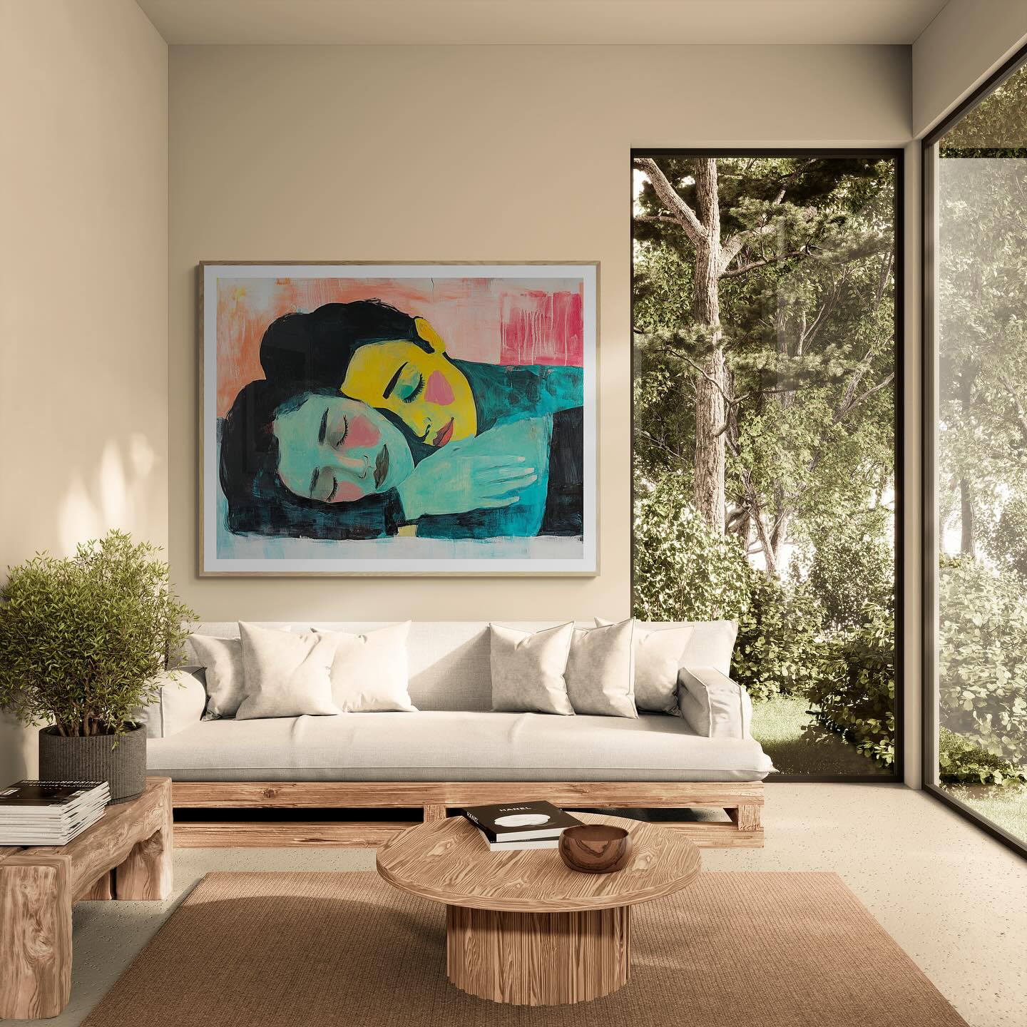 Para obras enmarcadas, sugerimos quitar con cuidado el embalaje protector y colgarla con la ayuda de dos personas, usando clavos resistentes. En el caso de obras de gran tamaño, si es posible, utiliza tornillos y tacos de pared.