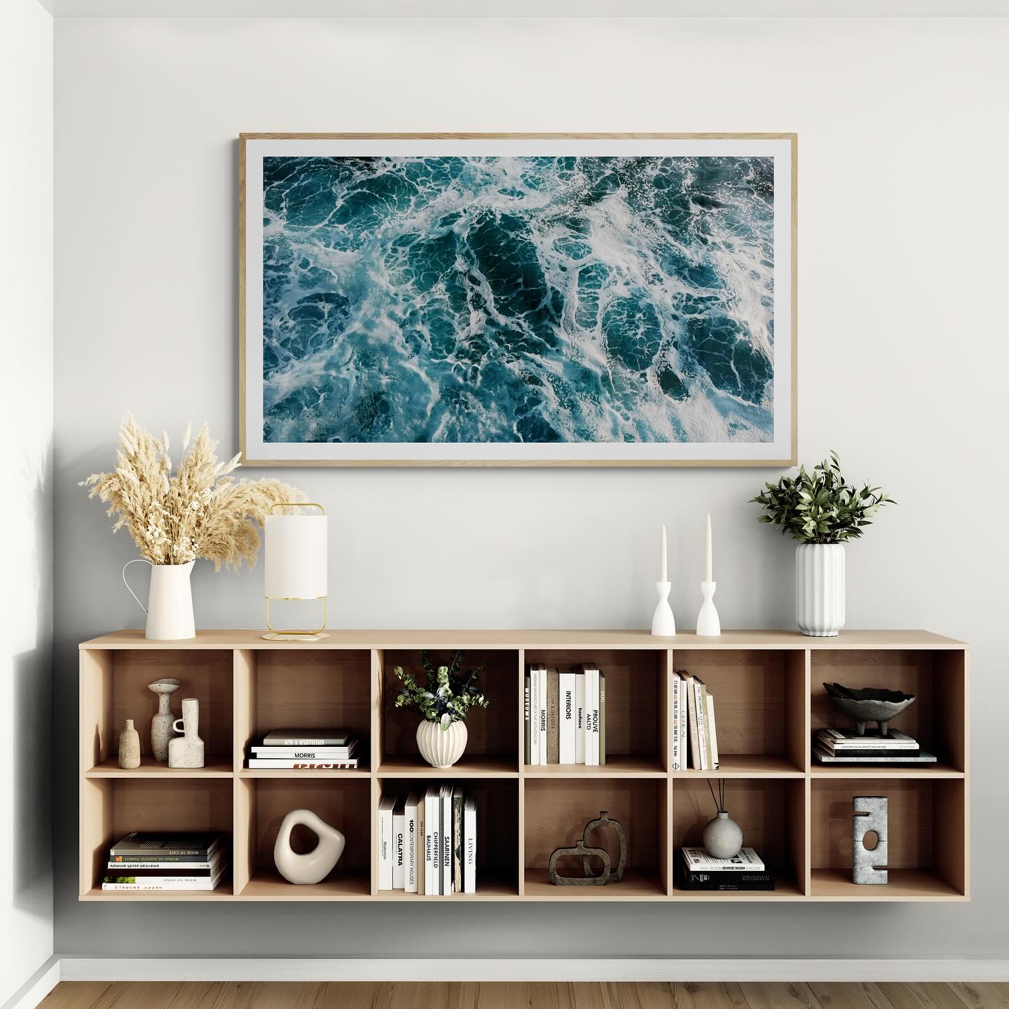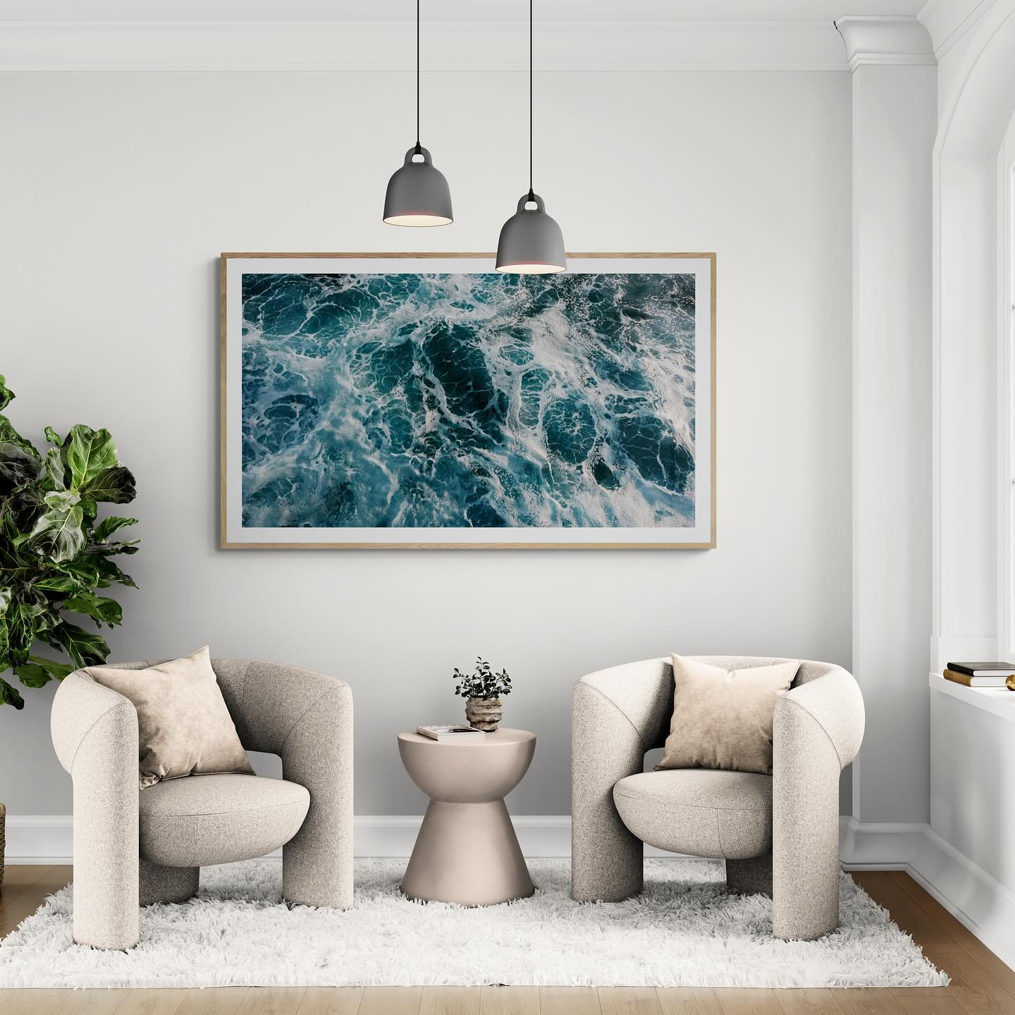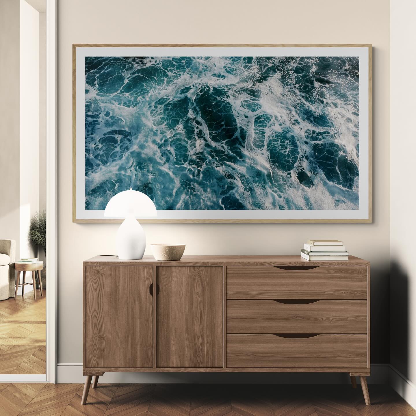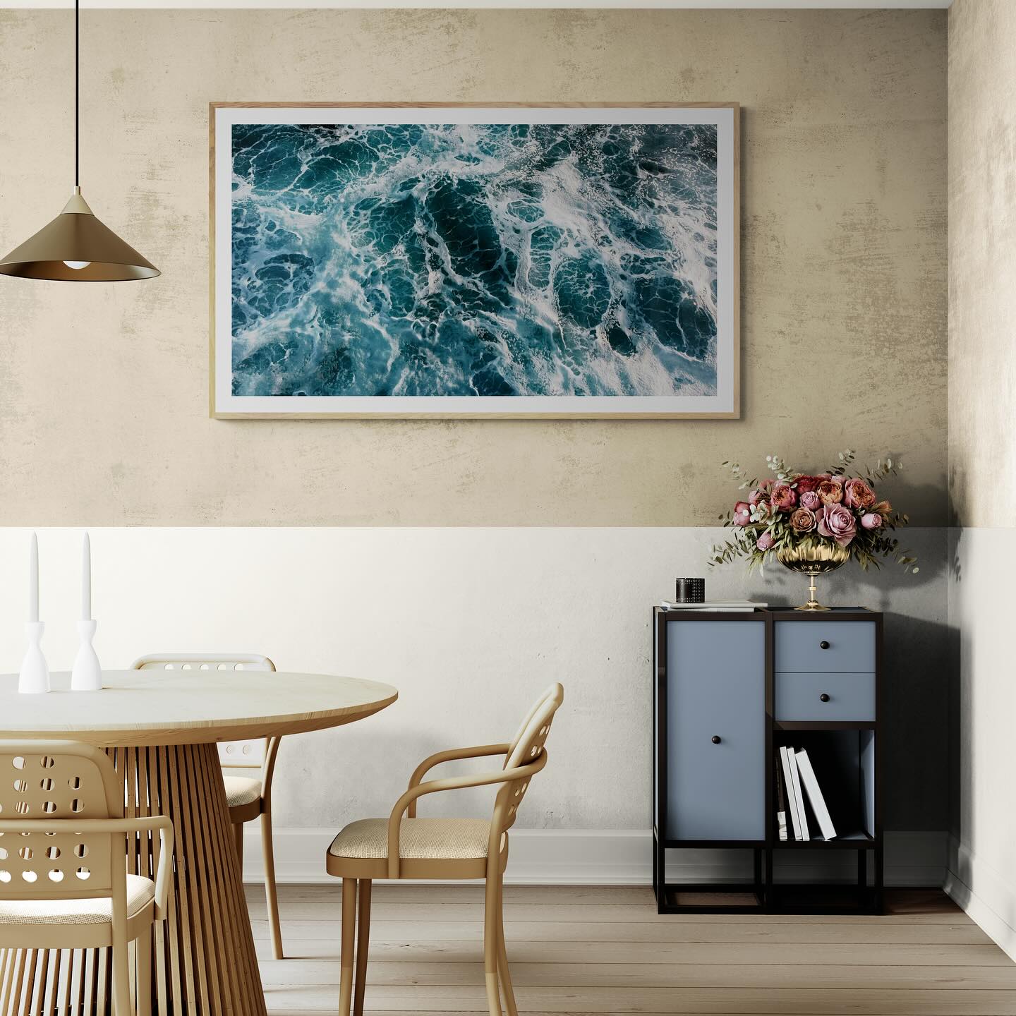 Para obras enmarcadas, sugerimos quitar con cuidado el embalaje protector y colgarla con la ayuda de dos personas, usando clavos resistentes. En el caso de obras de gran tamaño, si es posible, utiliza tornillos y tacos de pared.
