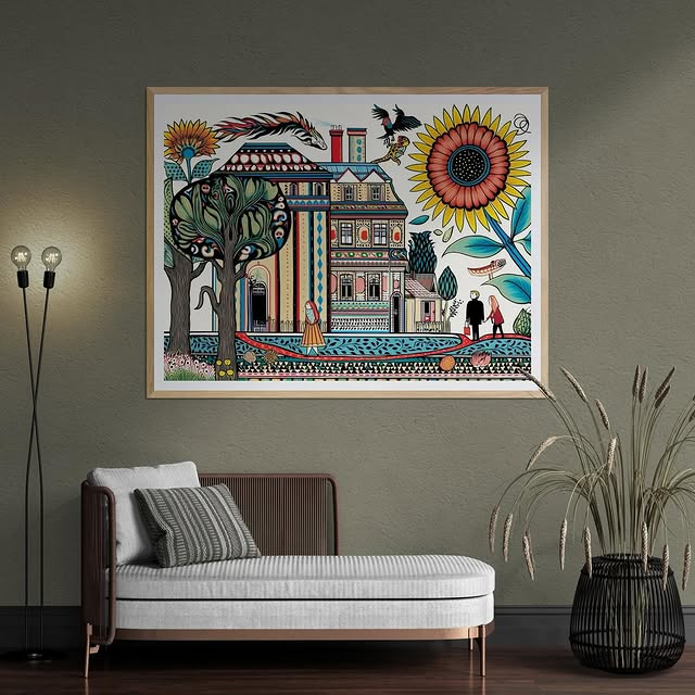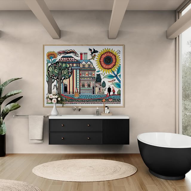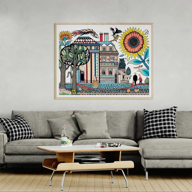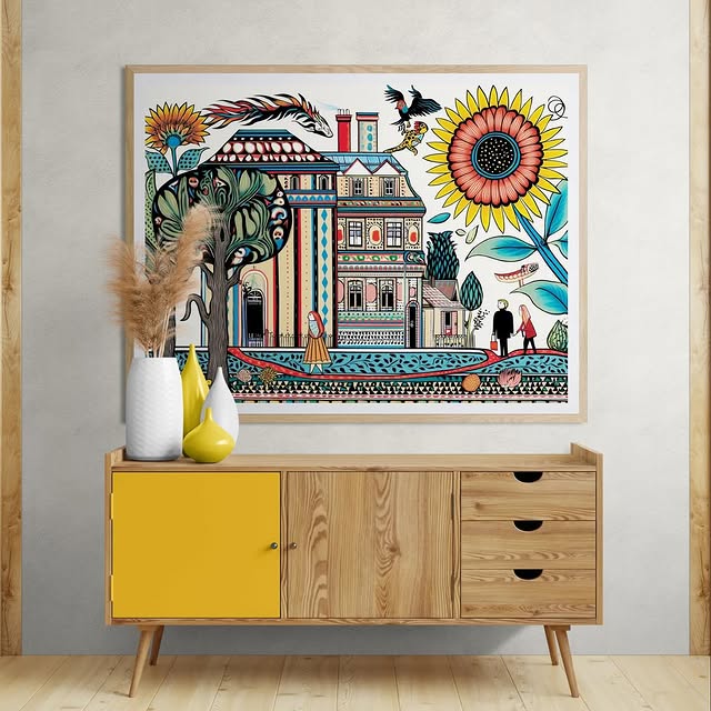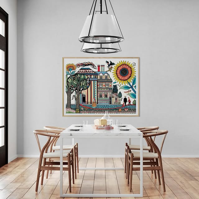Para obras enmarcadas, sugerimos quitar con cuidado el embalaje protector y colgarla con la ayuda de dos personas, usando clavos resistentes. En el caso de obras de gran tamaño, si es posible, utiliza tornillos y tacos de pared.
