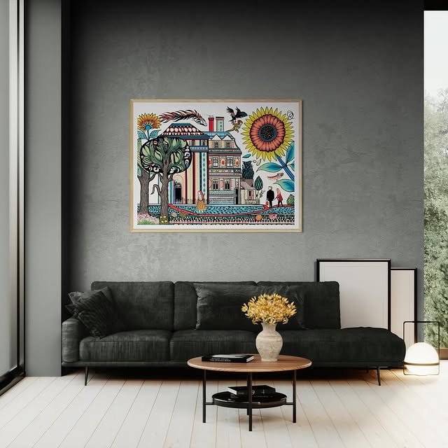 A colorful folk village scene.