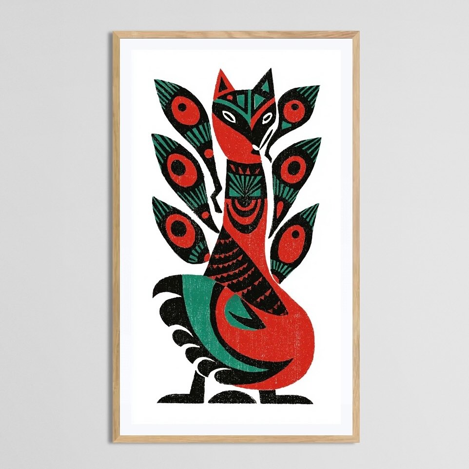 A stylized nine-tailed fox, Chinese woodblock print.